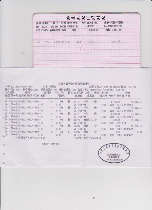 중국공상은행통장입니다.(2015년06월)