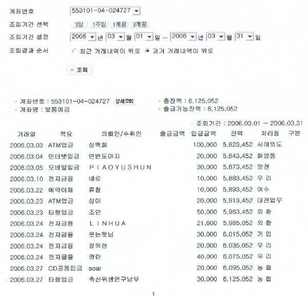 한국지역 2006년 3월 입금내용은 아래와 같습니다.
