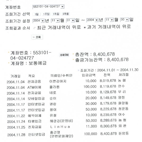 (연변문화재단).........100,000 원          총잔액 ......... 8,400,678 원