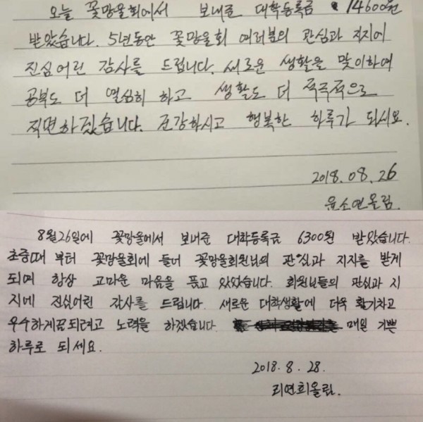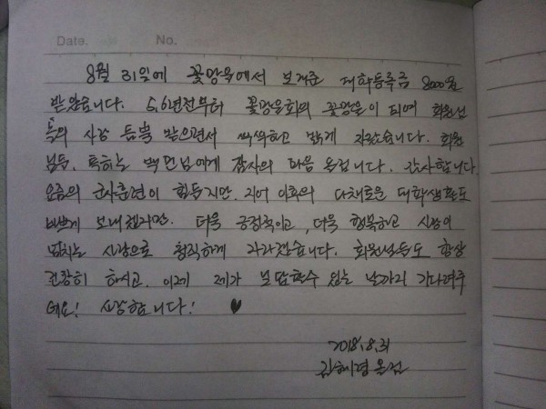 2018년 8월에도 꽃망울회에 따뜻한 후원을 보내주신 모든 분들께 감사드립니다. 꽃가족님들의 관심과 사랑으로 보내준 대학특별등록금은 8월 26일에 리연희, 김혜령, 윤소연 세 명의 꽃망울에게 모두 지급되였습니다. 또한 새내기 꽃대생들은 한창 군사훈련을 하고 있는 중이랍니다. 어제까지 초록의 물결이였는데 황금물결이 출렁이고 코스모스가 하늘거리는 수채화를 방불케 하는 가을이 성큼 다가왔습니다. 우리 꽃님들도 수확의 9월을 보내시길 바랍니다.