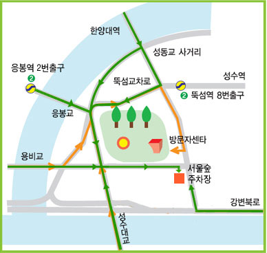 상계동 방면: 동부간선도로 → 군자교 → 강변북로 못미쳐 ‘성수대교ㆍ왕십리 방향’으로 진입 → 성수대교(북단)사거리에서 직진 → 무지개터널 → 서울숲 주차장